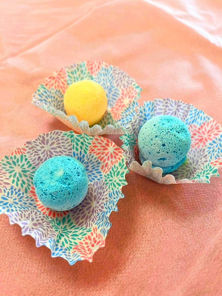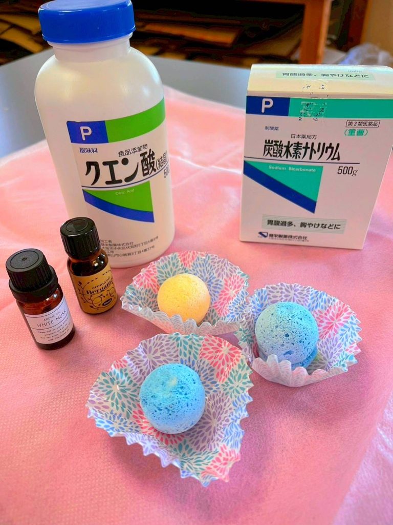 好きな色や香りを選んでオリジナルのバスボムを作ろう。重曹とクエン酸でしゅわしゅわと溶ける様子が楽しいよ。