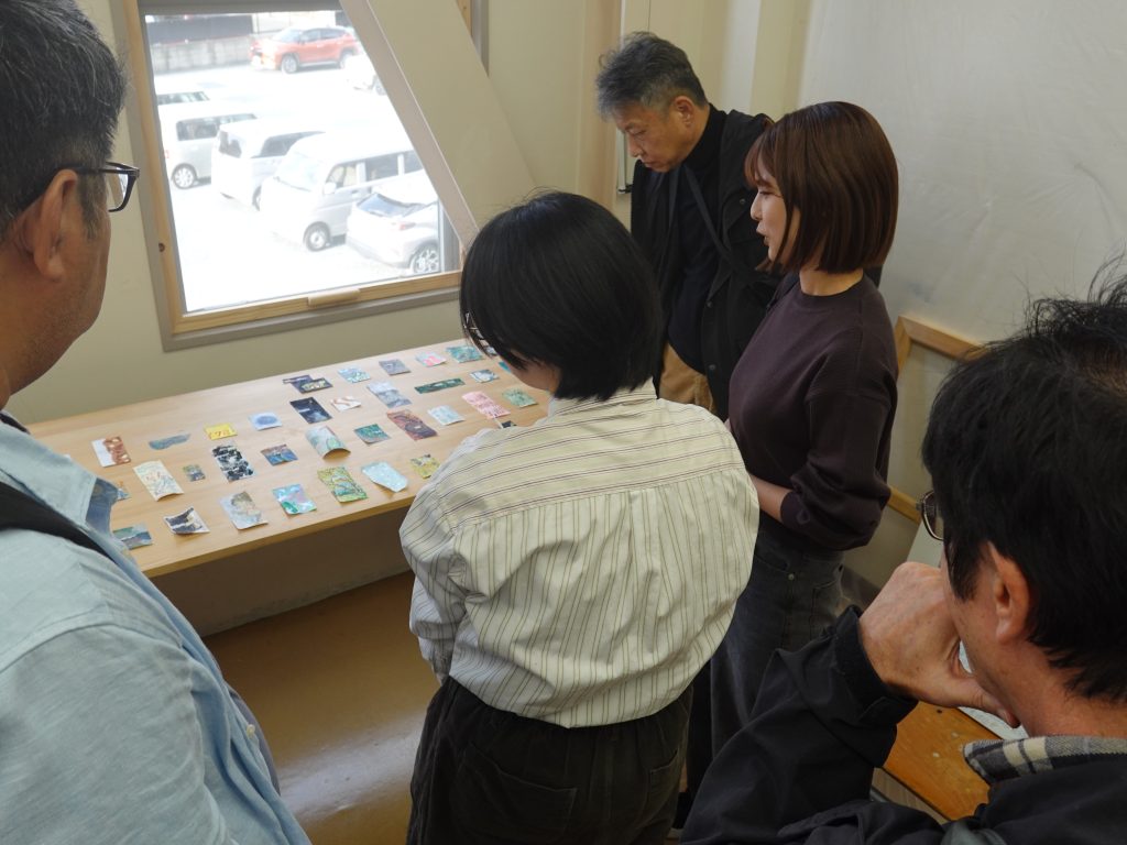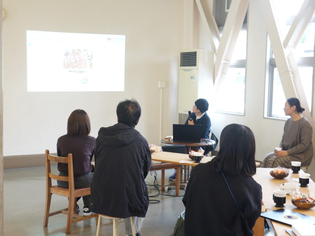 鴨江アートセンターで制作中の3名のアーティストから、浜松での制作活動について写真などを交えてお話をうかがいます。そのあとは自由な交流時間。近所のおいしいゴハンや、おすすめの場所の情報交換をしたり、アトリエを見せてもらったりなど、集まった方々とアーティスト、スタッフも混ざります。