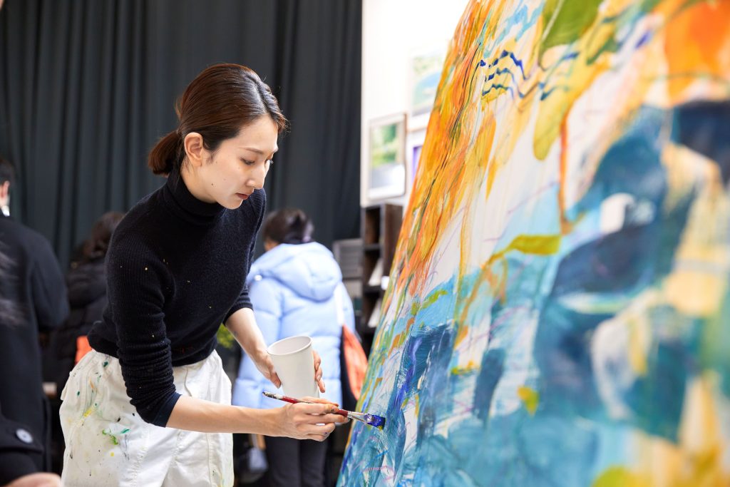 鴨江アートセンターの階段の踊り場にある4つの飾り棚“ニッチ”にて、アーティストの林満里奈さんが韓国・釜山市で開催された「UNDER39 Art Fair」(2025年12月5日(金)~14日(日))に出展した際に行ったライブペインティングで制作された作品を展示しています。釜山の海とイチョウの街路樹から着想した本作を通して、釜山の風景を覗くことができます。ぜひ、トークと一緒にご覧ください。