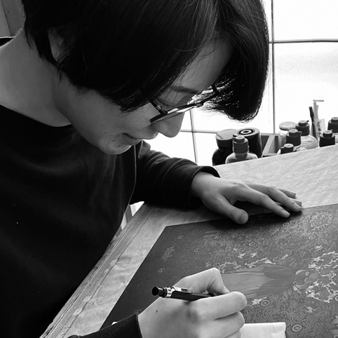 銅版画の腐食技法であるエッチングとアクアチントを用いて、慢性的な不安を含んだキャラクターを描いています。