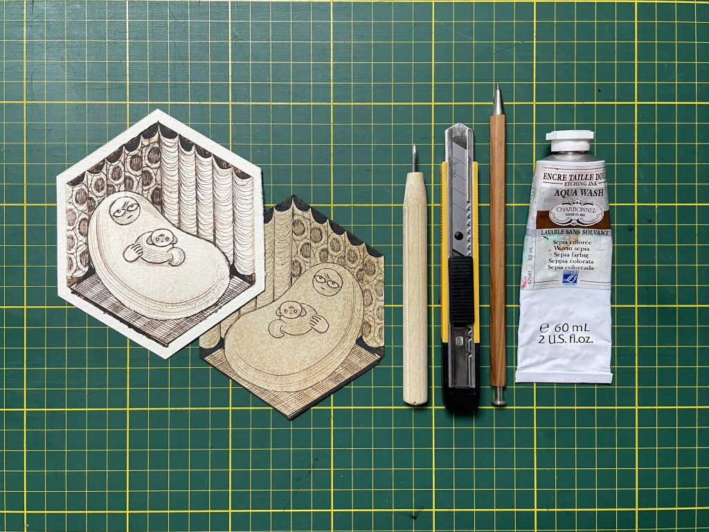 銅版画の技法としても知られていますが、小学生の時に学んだ木版画や消しゴムはんことはまた違った、繊細な線や陰影の表現を楽しめる版画です。